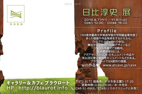 日比淳史展 2018年9月7日(金)〜11月6日(火) ギャラリー&カフェ ブラウロート いわき とは深いご縁を感じております。