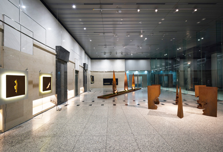 3連塔「時の塔」のかなたに見える風景を壁面レリーフとし、左から 「おぼろ」 「かすみ」 |