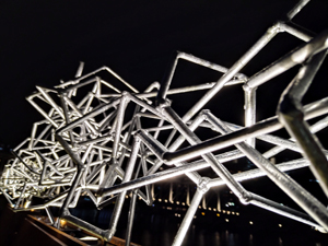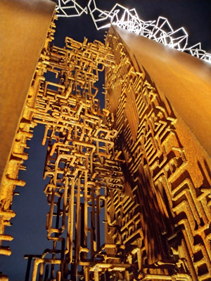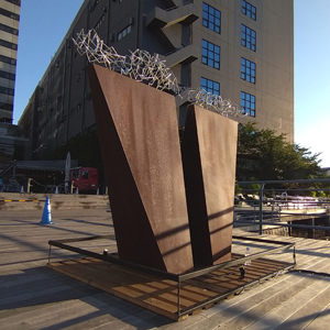 間合いの地 文明社会で働き、やがて錆びて土に帰っていく 「鉄」,,,, 本作品はその鉄の持つ時間性をコンセプトにした2つの支え合う鉄の造形物がどこか不安定な緊張感で立っている。それは文明という利便性は崩れやすいバランスの上に成り立っていることをイメージしています。錆びゆく鉄の時の流れを感じながら、昼は鉄の立体アート、夜はライトアートとして楽しんでいただければ幸いです。