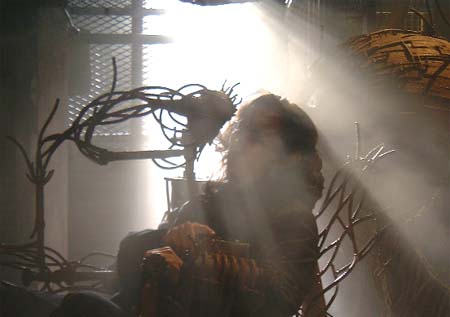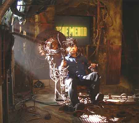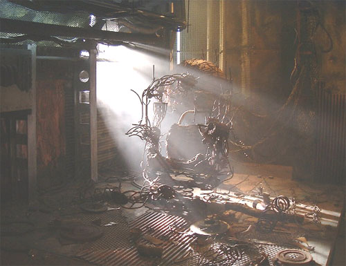 2000年、JIVE MEDIA のTV−CMです。 セット内にイスのような錆びた鉄のオブッジェと球体の作品を置き、そのイスオブジェに歌舞伎役者 片岡進之助さんが座り、背景には大きいモニターを置いて撮影したのです。 本番画像は公開できませんが、カメラTESTの時に撮った画像をご覧ください。 |