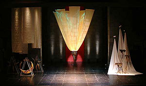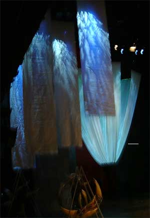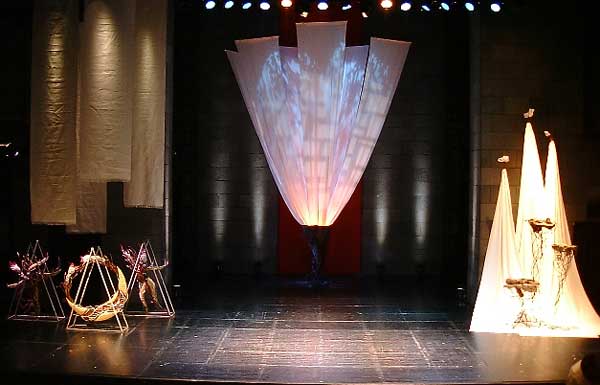 2002年の作品「夏の夜の夢」 友人の役者、大門裕明君主演の舞台。シアタートラム(三軒茶屋)にて。 オブジェとしては旧作を持ち込んだのですが、生地にはこだわって空間を作り、照明で色々な表情を作ることができるイメージ通りの出来になりました。 お忙しいのに足を運んでくださった皆様心より感謝しております。・