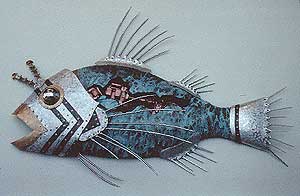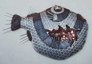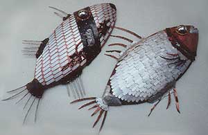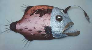 深海イメージのセット。 そこに日比イメージの魚や甲殻類、アンモナイトや三葉虫までいろんな生物を製作して配置しました。 その魚オブジェの一部をご覧ください。