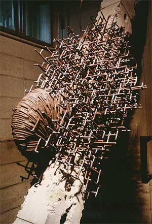制作イメージ この作品は芸大大学院の修了製作として 卒業制作発表展示は、東京都美術館で発表するのがお約束であったが、私のわがままを聞いてくださった教官室のご好意で金工棟の廊下に展示することが出来た、思い出深い作品です。 この展示の後すぐ東急Bunkamura 6F イベントスペースでの個展が決まっていたので、この展示が終了した後、リメイクして個展を開催した。 |