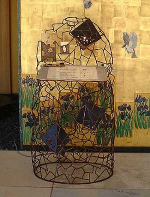 そこに置く私の作品は、 照明が入ってて、 ちょうちんのような、 ほたるのような光を発し、 お店の顔のような看板でもあり メニューのスタンドでもある・・ そんなオブジェをイメージして 製作しました。