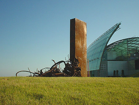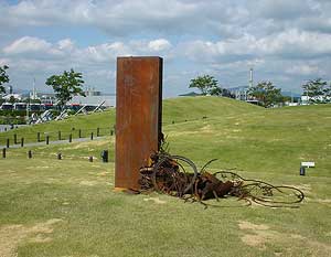 伊藤隆治氏と私で先に小名浜で環境芸術の活動を行っており、そこで拾った鉄くずを使って今回新作を製作しました。 タイトルの「進化と退化の関係」は、文明を表した鉄の幾何形体の直方体の立体から、鉄くずの臓物が出てしまっている・・便利な文明は、不要となるゴミも同時に生産している・・隠しきれないのに・・というイメージです。 今回の小名浜国際環境芸術祭の一環としての野外作品展なので平素、錆びて土に帰っていく時間性が好きで鉄や鉄くずにスポットライトを当てる私が、今回のテーマにダイレクトにのっとって、環境を考えるモニュメントになればいいな・・と製作いたしました。 展望台には、小名浜のゴミを使って |