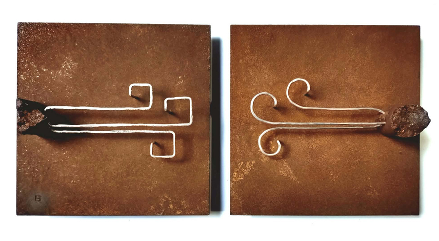 鉄と錆を素材の軸にする共通点を持つ、加藤彩夏と日比淳史。 同じ鉄でありながら造形表現の異なる二人の対比をお楽しみください。