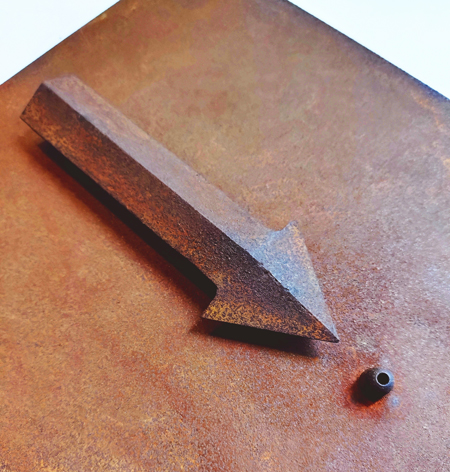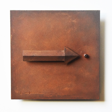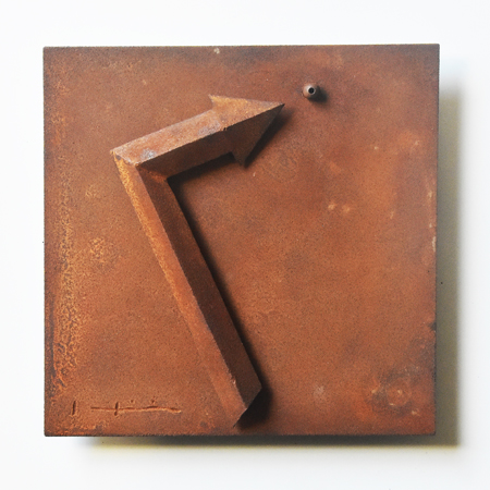 日比は、時よりテーマにする「風神雷神」や、以前から温めていた矢印モチーフなどを、小さいレリーフシリーズとして実作しました。 |